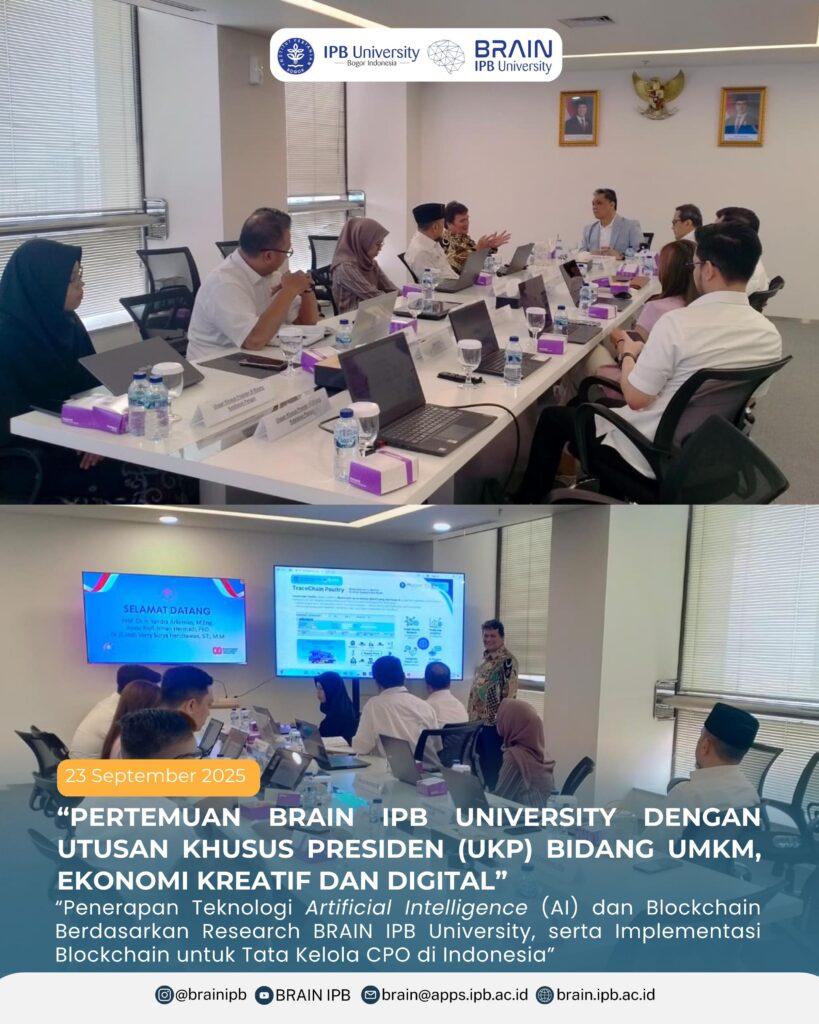 Dalam pertemuan ini Prof. Dr. Ir. Yandra Arkeman, M.Eng selaku Chairman of BRAIN IPB University memaparkan terkait penerapan teknologi Artificial Intelligence (AI) dan Blockchain berdasarkan research BRAIN IPB University, serta implementasi Blockchain untuk tata kelola CPO di Indonesia.
